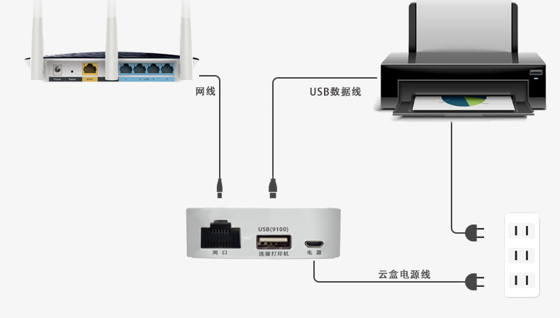 - 准备好线缆链接,将包装内的主机,电源适配器,网线 取出并将我们要连接的打印机准备好(打印机数据线自备),按照下方图片将设备间建立连接: